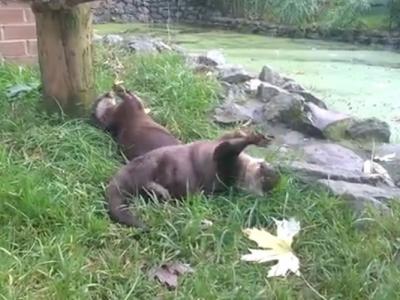 2头小水獭把玩小石头,俨如训练有素的杂技小丑。 石头偶然偏远了,小水獭仍可...