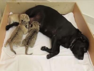 俄罗斯索契动物园黑色拉布拉多犬Grona承担起照料遭遗弃狮虎兽幼崽的职责 (神秘...