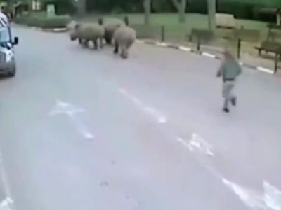 犀牛大刺刺的在道路上奔走,动物园经理一直在追。 犀牛之所以有机会逃走,是因...