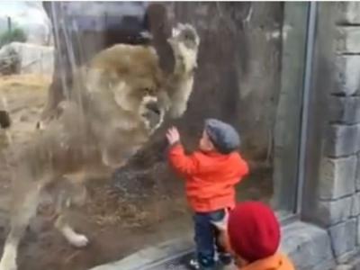 美国艾尔帕索动物园的非洲狮Zari与一名小婴儿隔着玻璃做“互动” (神秘的地球报...