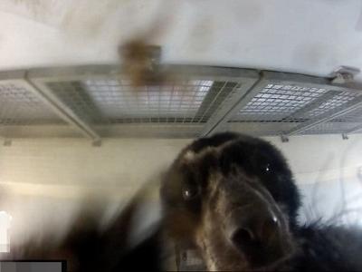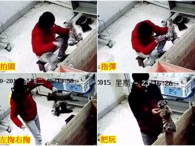 监控视频拍下饲养员在小虎饲养室内虐待幼虎的过程 幼虎(红圈示)被左揈右揈期...
