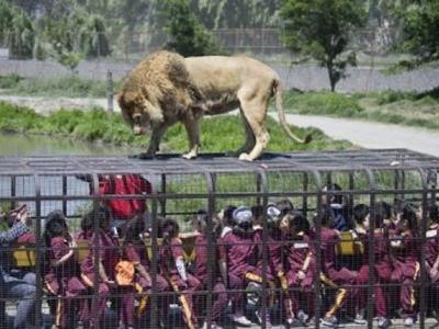 狮子跳上卡车,与在笼子里的游客近距离接触。 车顶事先放置好鲜肉引诱狮子 ...