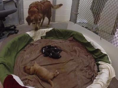 美国金毛寻回犬照顾非洲野狗宝宝