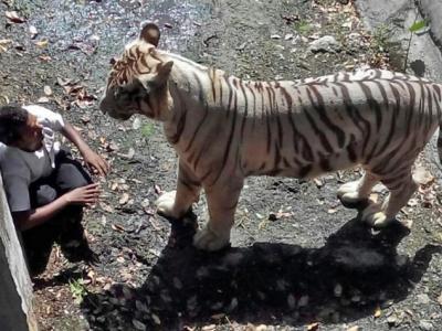 印度新德里动物园游客意外闯入老虎地头被