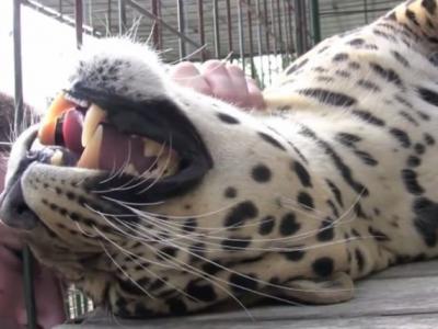 美国动物园员工伸手入铁笼替花豹按摩