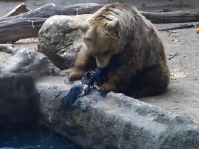 匈牙利布达佩斯动物园灰熊表现爱心拯救遇溺乌鸦 灰熊瓦利救起乌鸦后,默默走到...
