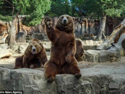 西班牙马德里动物园棕熊向游客挥手原来为