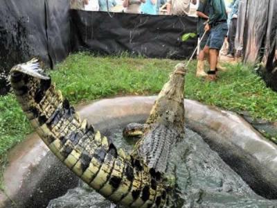 鳄鱼摆动身体,不愿迁往新的居所。 工作人员经过多番激战,最终把鳄鱼“驯服”...