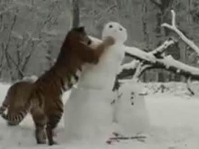 一只老虎直扑到雪人的脸部,将雪人摧毁 老虎先是围着雪人绕走了数圈,还不断嗅...