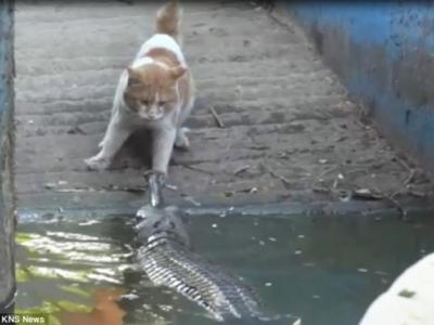 印度动物园,一条鳄鱼游近一只猫咪 猫咪毫不畏惧,挥起猫爪扇向鳄鱼 猫咪摆...
