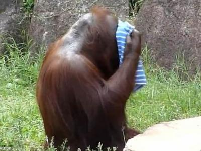 日本动物园猩猩会用毛巾洗脸并拧干毛巾