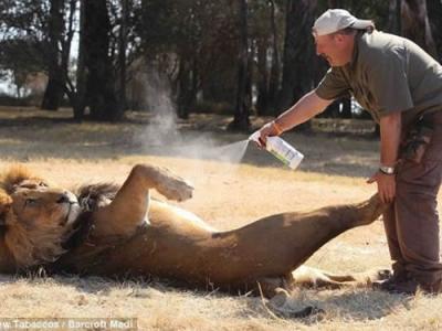 动物园管理员为狮子喷洒定型剂梳理鬃毛