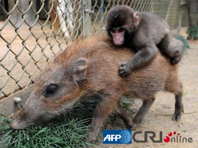 日本动物园小猴子骑小野猪