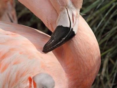 可爱的小火烈鸟依偎在母亲温暖的羽翼下。它还没有取名字,是10月在西雅图的森林公...