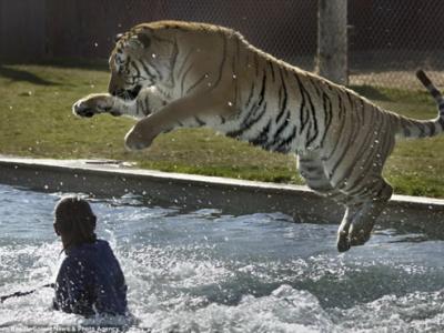 一只成年虎跳入泳池追逐一名动物园管理人员 为了从顽皮的老虎眼皮底下逃走,一...