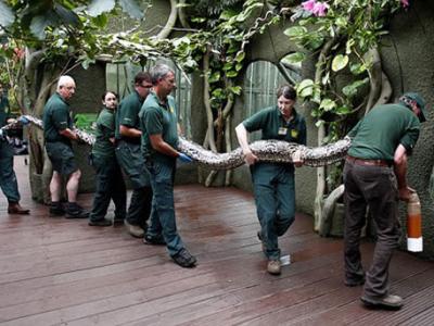 切斯特动物园的7名工作人员,抬着长近7米的巨蟒巴里去做健康检查 激动的巴里露...