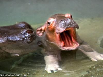 河马宝宝张开小嘴的可爱瞬间,将来它的嘴里会长满巨大的牙齿 埃玛尼很保护它的...