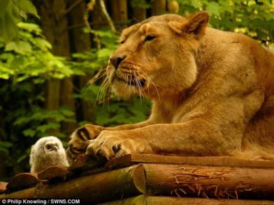 小猫头鹰不幸跌落至狮子园,但母狮对其毫无兴趣。 英国德文郡退休教师、现年...