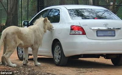 狮子好奇地拍打着白色丰田轿车,试图打开车门 狮子竟然打开了车门,车内人员被...