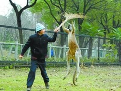 袋鼠向饲养员挑衅 袋鼠躲闪饲养员的竹扫把 袋鼠抢夺饲养员的竹扫把 饲养...