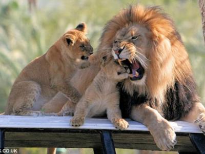 动物园雄狮发怒咬住调皮幼狮脑袋