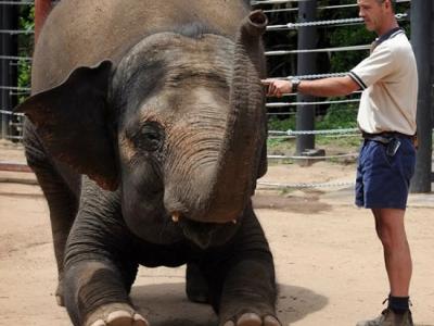 德克科恩正在做伸展运动强化肌肉,用以帮助自己顺利生产 在墨尔本动物园,饲养...