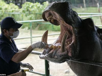 哥伦比亚圣达菲动物园,工作人员正在仔细检查Orion的牙齿。 在张开大嘴的同时...