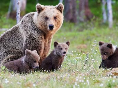 俄罗斯鄂木斯克州波利舍列奇耶动物园棕熊冬眠后第一次现身 还带出三只期间出生的幼...