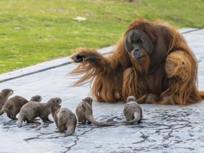 比利时布吕热莱特市天堂动物园红毛猩猩家庭与亚洲小爪水獭一家...