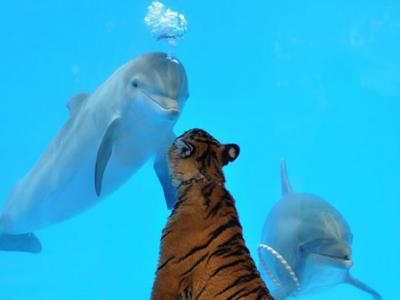 美国加州动物园老虎与海豚成为朋友 美国加州动物园老虎与海豚成为朋友 美国...