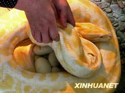 4月25日,合肥野生动物园的工作人员查看黄金蟒产下的卵 合肥野生动物园一条人工...