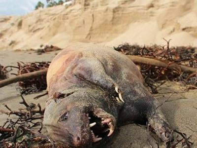 美国加州遭风暴吹袭后圣巴巴拉海滩出现怪物尸体 两年前在圣迭戈发现的猪形怪物...