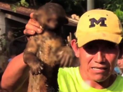 有村民拿起烧焦的蜜熊尸体。村民将蜜熊当作山羊吸血...