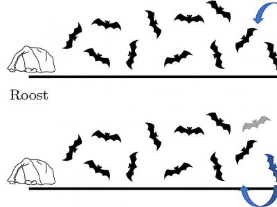 一维运动跳跃策略示意图。黑蝙蝠都在随机移动。以蓝色突出显示的最远距离会发生对流...
