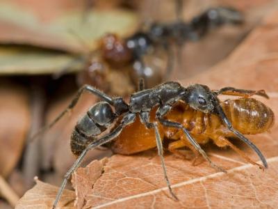 在几内亚的里约卡帕切斯,一只马塔贝列蚁在突袭行动中带走它的白蚁猎物。 PHOTOG...