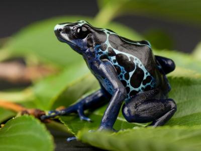 这只蓝黄色相间的箭毒蛙(摄于美国堪萨斯州日落动物园)透过颜色宣告它具有毒性。...