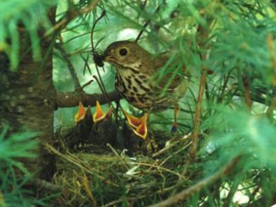 北温带鸣禽(如这只隐士鸫)常常会养育4只或更多的雏鸟,而热带鸣禽则通常只会养...