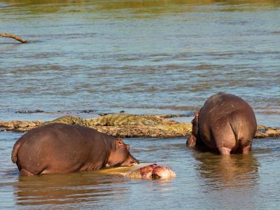 2014年4月25日,南非克鲁格国家公园中的一只河马吃着另一只河马腐烂的死尸Photog...
