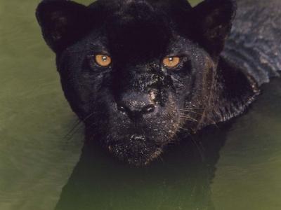 一只黑色的美洲豹(Panthera onca)蹲在巴西的一座水池内。黑色的美洲豹又称黑豹...