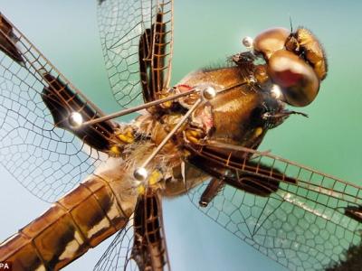 科学家把微小的反射标志安装在蜻蜓身上,并拍摄它们的慢动作,测量飞行中的蜻蜓的...