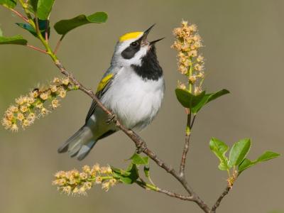 一只金翅虫森莺(学名Vermivora chrysoptera)在美国密西根州的一棵树上唱歌。摄...
