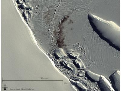 在这张拍摄于2010年的卫星照片中,棕色污迹显示出南极洲科贝克角的一个皇帝企鹅族...