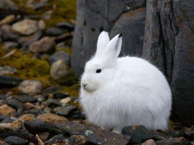 在加拿大,一只毛色呈白色的雪鞋野兔缩成一团。 Photograph by Robert Harding, ...