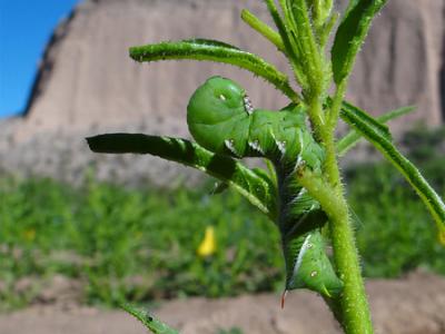 在犹他州的大盆地沙漠,一只烟草天蛾的幼虫正在大吃烟草植物。摄影: Ian T. Bal...
