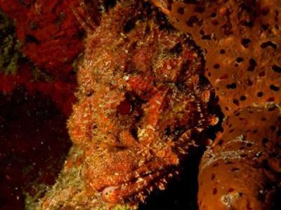 石头鱼躲在海绵的后面 据EurekAlert!:珊瑚礁代表了地球上某些最多产的生态系统...