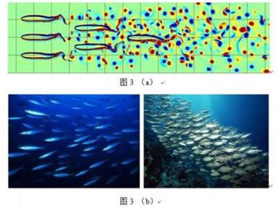 (a)鱼群游动时的涡量场(b)自然界中的鱼群 鱼游摆动中轴线上水平时均速度的...