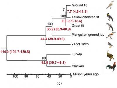 对68个单拷贝直系同源基因的系统发育分析,揭示了地山雀与大山雀和黄颊山雀比黑尾...