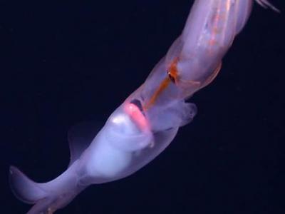 一段新拍摄的关于葛氏双鳍鱿的视频揭示出其捕食猎物的方式 许多深海鱿鱼常主动出...