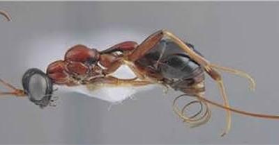 雌性寄生蜂拥有长长的产卵器,可以用来刺穿蜘蛛圆顶巢穴厚厚的墙壁 Zodarian食...