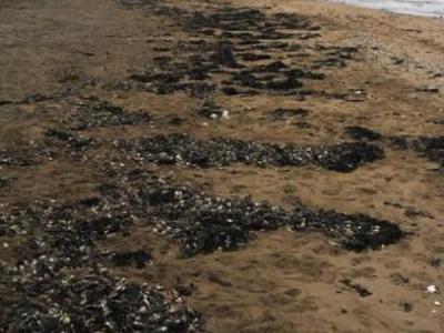 被冲上英国海岸的数千只死蟹,它们可能死于海水温度过低。去年的12月是英国120年...